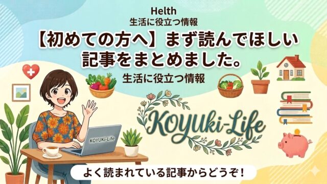 Helth 【初めての方へ】まず読んでほしい記事をまとめました。 2026年3月7日 koyuki こんにちは、こゆきです。 このブログでは、生活に役立つ情報や実際に役立ったことをまとめています。 初めての方は、よく読まれてい …